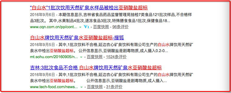 2016年同样产自长白山的农心白山水被检测出“亚硝酸盐超标”。农夫山泉和恒大冰泉也没有公布亚硝酸盐指标。